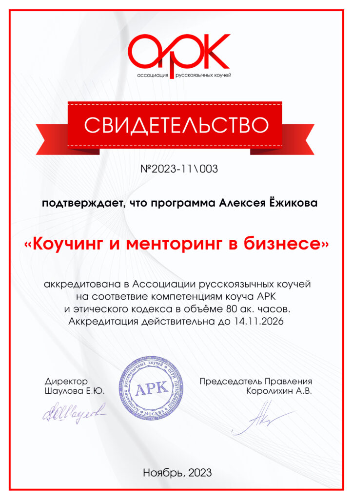 Алексей Ёжиков — executive-коуч в когнитивно-поведенческом подходе, член Правления, коуч-мастер и супервизор АРК, руководитель Секции «Коучинг» и супервизор АКПП, PCC ICF.